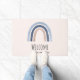 Welcome doormat with a cute and whimsical rainbow. Blue and peach watercolors.
