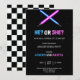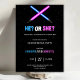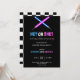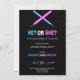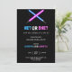 Gender reveal party invitation featuring blue and pink lightsabers crossed over a starry background with playful text 'He? or She?' and event details."