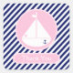 A preppy, nautical design with a white sailboat silhouette, that has a blue anchor, and pink heart on the left sail, inside a pink circle frame, on a background of navy blue diagonal stripes.