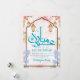 Celebrate Eid with this stunning floral card. It features a dark chocolate-colored Islamic arch surrounded by lush blue forget-me-nots and pink lilies. Delicate hanging lanterns complete this high-end, artistic look.