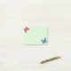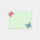 Post it notes with cute red and blue butterflies and three gold metallic look confetti dots on light green background.
