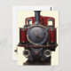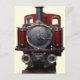 vintage train in the steampunk style in red and blue colours with wheels, windows, nose, nuts and bolts, metal rings, red metal facade, and grey blue facade and looks like a toy. colour photography of the front of an antique steam train in smooth metallic muted colours in reds and blues.