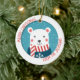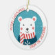 This cute Christmas tree ceramic ornament features a fun and cute polar bear with a red and white scarf and a blue sweater in a light blue snowy background.