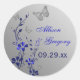 This 1.5" round royal blue and silver grey floral wedding favour sticker or envelope seal has butterflies and flowers on it that matches the wedding invitation shown below. If you require any changes, or want any other matching items, please email niteowlstudio@gmail.com.
