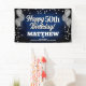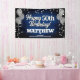 Fun banner sign for indoors or out, featuring festive silver metallic balloons on both sides of the design with sparkly, silver metallic confetti on a rich textured blue background for your personalised birthday banner. This product doubles as a wonderful milestone birthday keepsake.