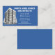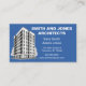 A monochrome line drawing of a multistory building on a blue background creates a professional and sharp design for an architectural firm. It could also be used for developers or real estate agents.