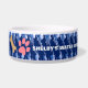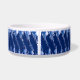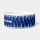 The original artwork by ZoeSPEAK on this breezy looking Dog Bowl is a pattern with a mood of the seaside. Done in marine blue and white, the bowl is banded by shapes which look like water droplets in a diagonal pattern. At the centre of the band is text in white which reads "SHELBY'S WATER BOWL". This is set to personalise with your own dog's name, or delete if you like. To the left of the name is a pink paw print and a light brown dog bone. These, too, can be moved or removed as you wish. A casual chic doggie look with coordinated tableware for humans.