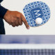 This stylish monogram Ping Pong Paddle features a modern blue and white woven rattan cane pattern on the front and back. The front side has a notched blue frame with an initial in white.