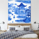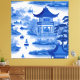Blue and white traditional style chinoiserie landscape with pagodas and rice boats