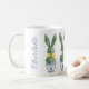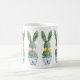 This Easter ceramic mug features cute bunny rabbit green topiaries with pink and yellow bows in blue and white chinoiserie flowerpots. Personalize with your choice of name or special holiday message. Great for Easter baskets and gift bags.