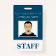This custom photo identification badge features a sample photograph in the centre, over an ocean blue coloured background. The title "STAFF" is printed below it in bold to signify the individual as a staff member for your event or organisation. You can include your company name or additional text above the image, as well as an employee name. The back of the badge features additional employee or company information printed over a matching blue background, with a sample barcode placed at the bottom. You can replace the scan code with your own, or another image, such as a custom logo.