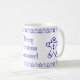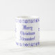 Blue and White Modern Christmas Tree and Gingerbread Man Pattern with custom text Merry Christmas Alexander! in Elegant Script, you can change or delete the text, Winter Season Holiday Coffee Mug for kids of all ages
