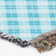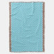 Blue and white diamond-patterned blanket shown horizontally and vertically with beige fringes. The design conveys a cozy, homey feel.
