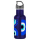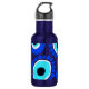 Colourful water bottle printed with a pattern of large blue, white and black evil eye symbols. The Evil Eye was considered in Ancient times to protect the bearer from the gaze of other people's evil stare. These days this colourful symbol is seen as a lucky charm, talisman, and good luck symbol.