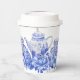 These bridal shower tea party paper cups have a monochromatic design featuring a blue and white tea set surrounded flowers.