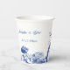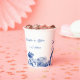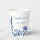 Create some personalised paper cups that have the look of antique china. This paper cup is ready to be personalised with the names of the bride and groom and their wedding date or with your own custom message. It has a blue and white floral and bird motif that's made to look like traditional china plates for party supplies with an elegant look.