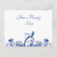 These postcards are ready to be customised with your own message on the front and are illustrated in the style of classic blue and white china dishes with a floral motif with bird accent. There's plenty of room on the reverse side for adding a longer message.