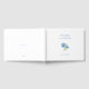 Lovely blue and white wedding guestbook, featuring a floral hydrangea illustration, couple names and date at the back, against a white background.
