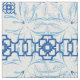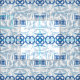 Blue and White Chinoiserie Pattern with Geometric and Botanical Flowers and Leaves.
