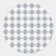 Blue and white geometric pattern on a circular sticker, featuring crosses and squares. Below, a sheet displays multiple identical stickers. Simple and modern.