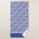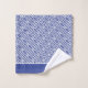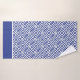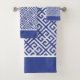 Blue and white Greek key pattern towels with stripe detail. Coordinating shower curtain and bath mat available.