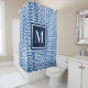 A white and blue Greek key maze pattern with a dark blue and white single letter monogram.