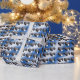 Pictured on a blue and white gradient background, are three blue ringed lawn bowls with a jack