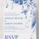 This beautiful all in one wedding invitation features an attractive combination of blue and white line art flowers and elegant typography, creating a unique design perfect for both spring and summer weddings. The right side of the invitation showcases the delicate line art flowers, while the names of the couple are featured in a stylish font. This invitation ensures that your special day is celebrated in style.