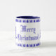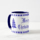 Blue and White Modern Christmas Tree and Stars Pattern with custom text Merry Christmas in Elegant Script, you can change or delete the text, Winter Season Holiday Coffee Mug