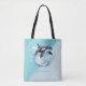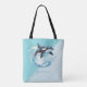 The ocean blue and light blue background of this tote bag sets a serene and refreshing tone, reminiscent of the vast expanse of the sea. Emerging from these tranquil waters is a magnificent orca, its sleek form leaping with grace and power. This fun and pretty design capture the spirit of these incredible creatures and evoke a sense of wonder and admiration.