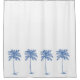 This modern coastal inspired shower curtain features blue palm palmetto trees on a background of solid white. Fun for a beach inspired bathroom.