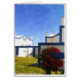 Blue and white Portuguese houses with bougainvillea against a clear blue sky blank greetings card