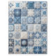 A quilt showcases intricate patterns resembling snowflakes, each block featuring unique blue and white designs