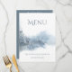Blue and White Soft Watercolor Wedding Menu designed with a winter scene in blue and white. The front side text includes: the Bride and Groom's Names and Wedding Date. The reverse side text includes: your complete menu selections from Appetizer to Dessert. To personalise this menu simply insert your details into our easy template replacing the sample text.