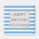 A cool light blue and white striped pattern and a Happy Birthday text template. Click personalise to add your name.