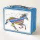 This colourful Unicorn graphic will delight any child who likes horses and unicorns. These sturdy vintage metal lunch boxes are very popular now, as they were year ago!
