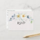 A beautiful wedding RSVP card set on a white background with a blue and white watercolor flower