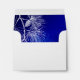 A custom A2 sized response envelope with room for your address info front and back and an inside lining of an elegant pattern of pine boughs and pinecones in blue and white on an icy background of blues and violet.