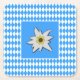 Oktoberfest blue and white diamond pattern paper coasters, with a solid blue square, in the middle, with graphics of the white Alpine flowers called Edelweiss.