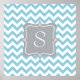 A blue and white chevron zig zag pattern has a light grey monogram frame with customisable initial.