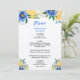 This beautiful and elegant wedding menu features watercolor blue, yellow and white flowers with foliage. The text combines handwritten script and serif fonts for a stylish and modern look. This is perfect for a spring or summer rustic wedding.