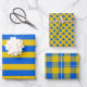 Ukrainian themed blue and yellow wrapping paper set represents Ukraine flag-inspired set of buffalo plaid, striped paper, and polka dot gift wrap for Ukraine Independence Day or supporting Ukraine on any other day. A perfect yellow and blue gift wrapping paper to celebrate Ukrainian victory, and as patriotic gesture for any occasion!