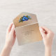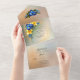 Elegant wedding tri-fold all in one invitation done in a gold tone colour. A framed area for custom text is edged with lovely graphics of blue and yellow iris flowers. Matching wedding products are available.