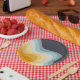 Retro style waves geometrical pattern illustration with yellow, orange, blue, light blue, navy blue and mustard colour stripes decoration for everybody who likes retro style colour palette and design.