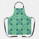 This apron has a mid-century modern design of arrows in two shades of blue on a field of seafoam green.