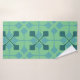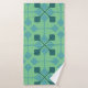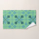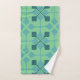 This towel set has a mid-century modern design of arrows in two shades of blue on a field of seafoam green.