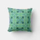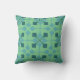 This throw pillow has a mid-century modern design of arrows in two shades of blue on a field of seafoam green.
