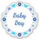 This awesome shaped sticker sheet features a digital art image of a group of flowers and butterflies, each a shade of blue to represent a baby boy. The flowers include Dahlias, water lilies, forget me not and Chrysanthemums.