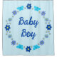 This awesome shower curtain features a digital art image of a group of flowers and butterflies, each a shade of blue to represent a baby boy. The flowers include Dahlias, water lilies, forget me not and Chrysanthemums.
