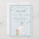 This custom baby shower invitation features a cute watercolor style illustration. A little baby boy elephant is pictured at the bottom holding a blue heart shaped balloon. A stack of alphabet blocks is placed in front of him. The background is a soft blue colour.